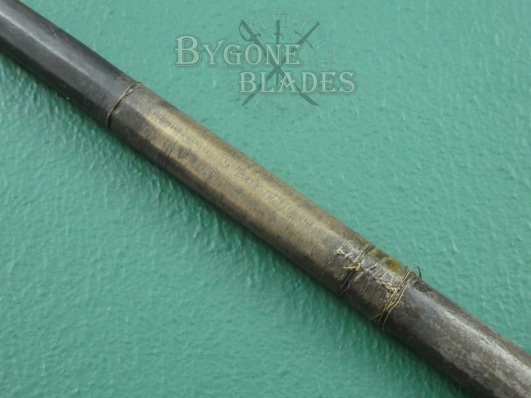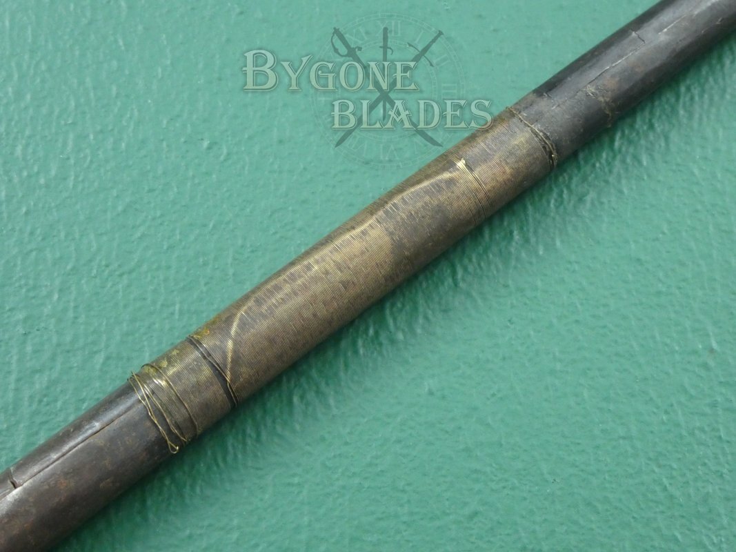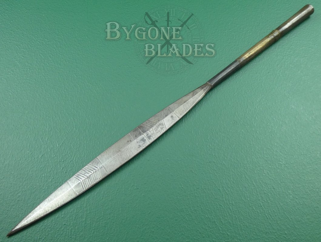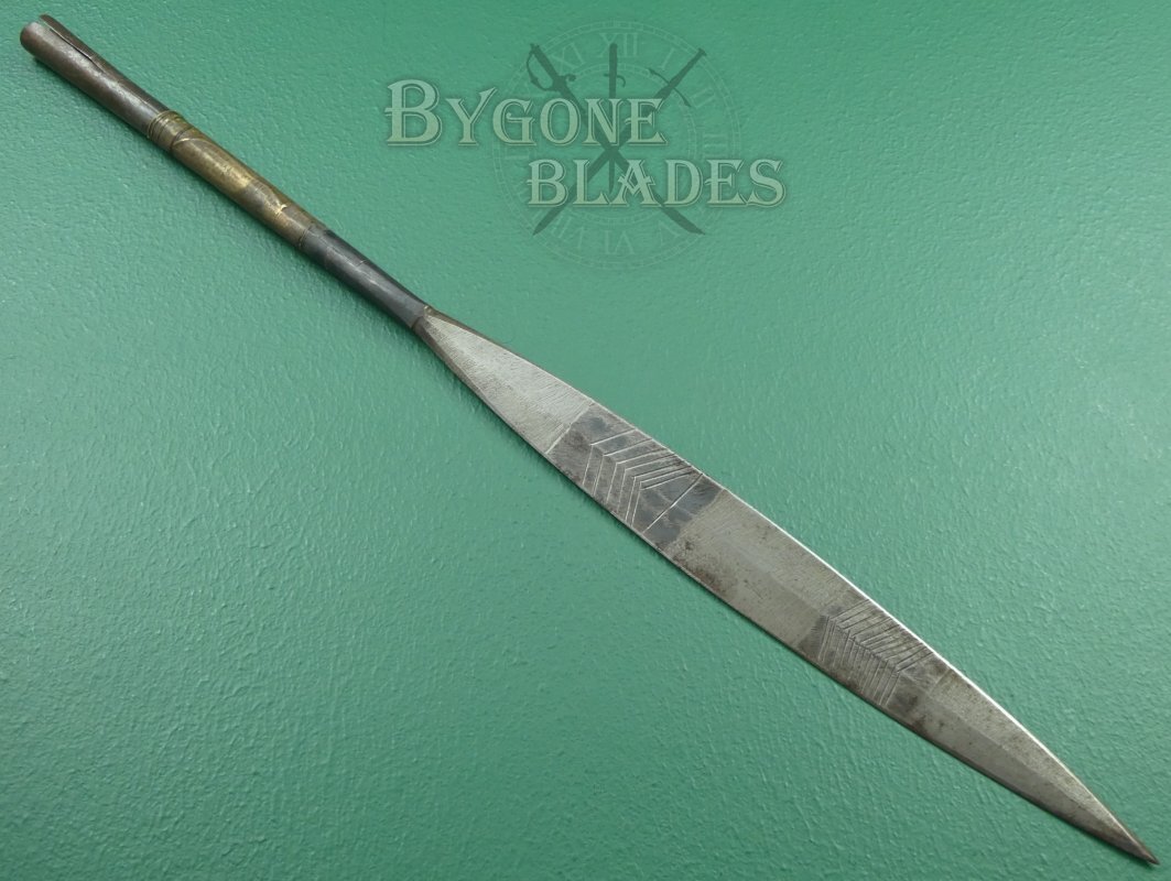 The long socket is thick walled and faceted. The middle of the socket is bound with decorative brass wire. This spear is in very good condition and is a well forged and robust weapon with a total length of 570mm.