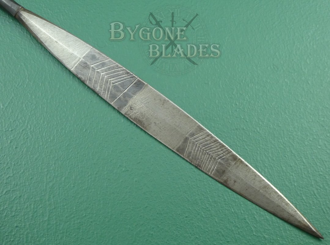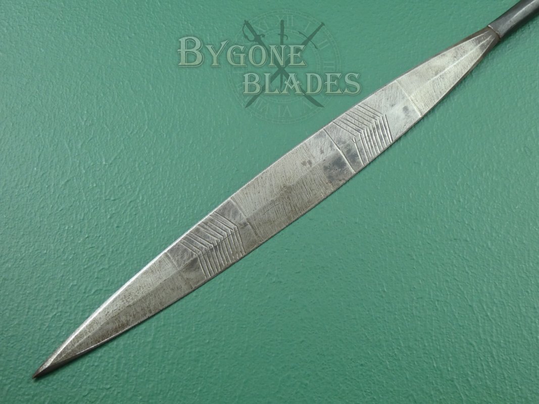 This spear has a large, 340mm double-edged blade. The well-forged leaf-shaped blade is decorated on both sides with two panels of chevron-like incised lines.
