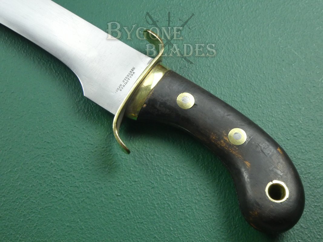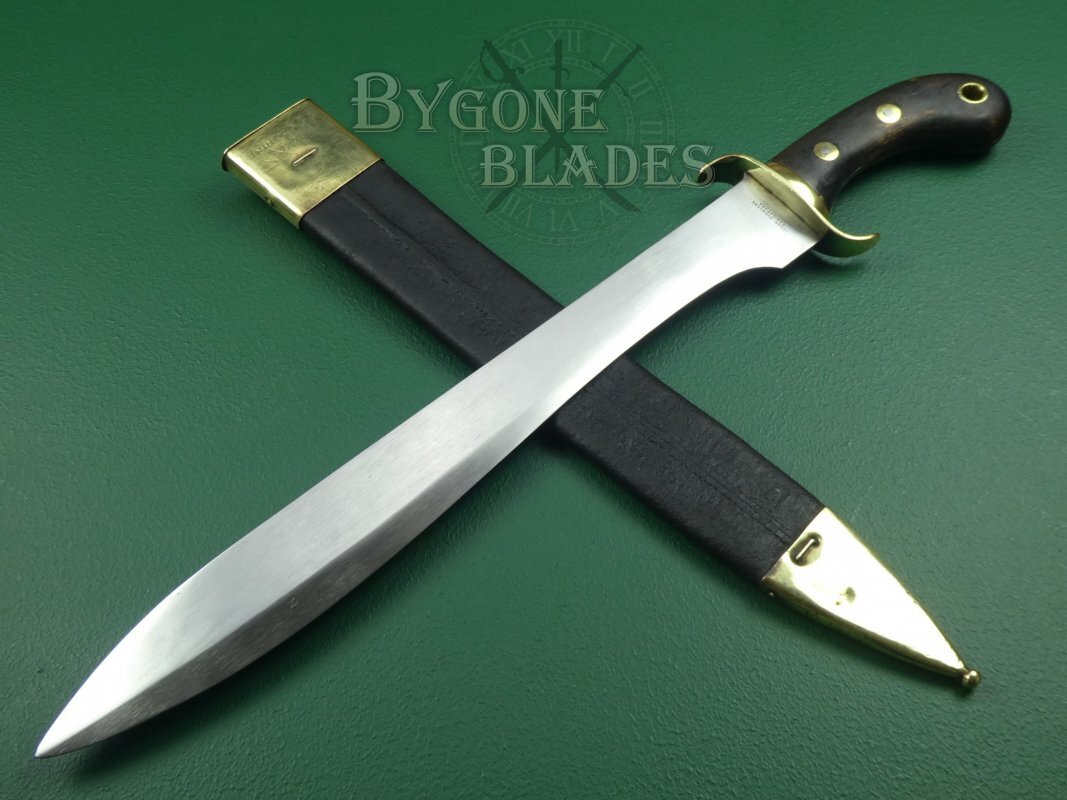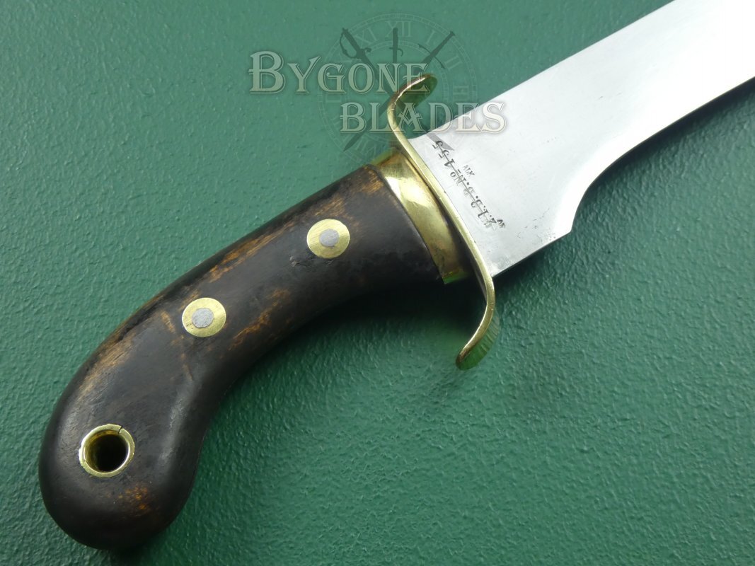 The 435mm single-edged blade has a thick, flat spine and ends in a spear point. The heavy blade is 55mm wide at the ricasso then narrows to a 40mm waist before widening again to 52mm. The bellied blade is ideal for chopping and cutting and was intended for use in clearing ground as well as being a close quarter weapon. The blade is in excellent condition.