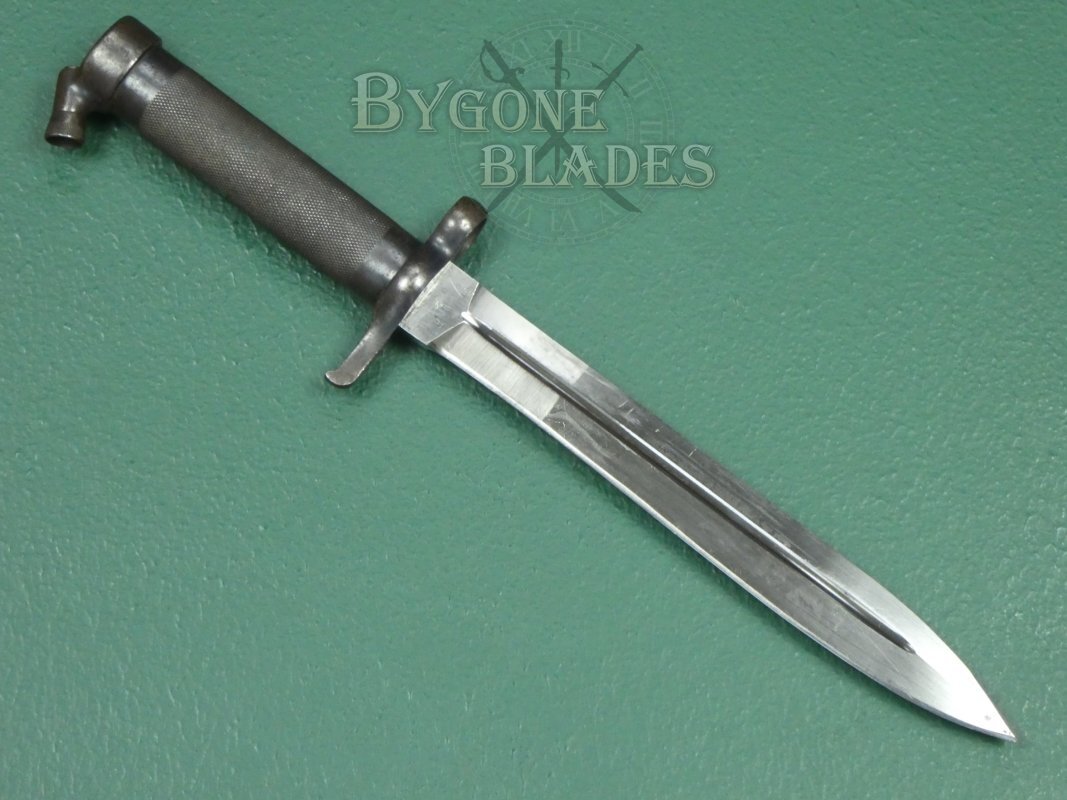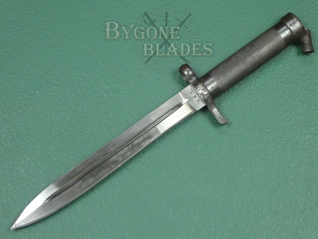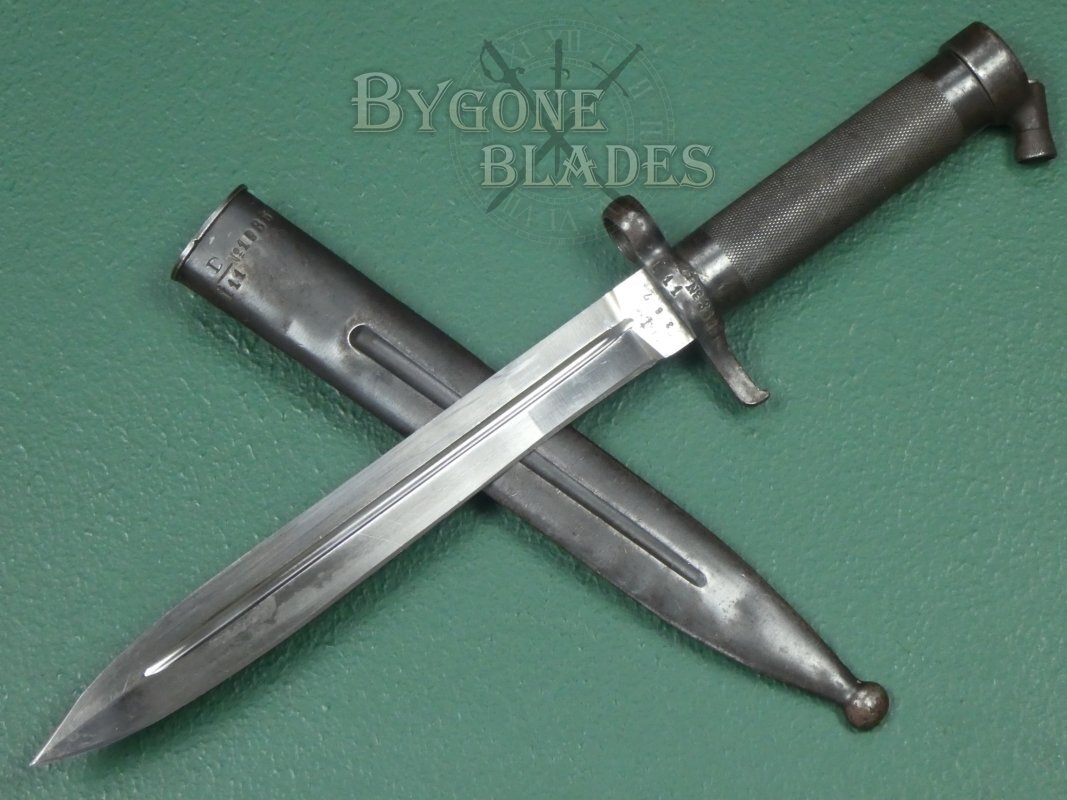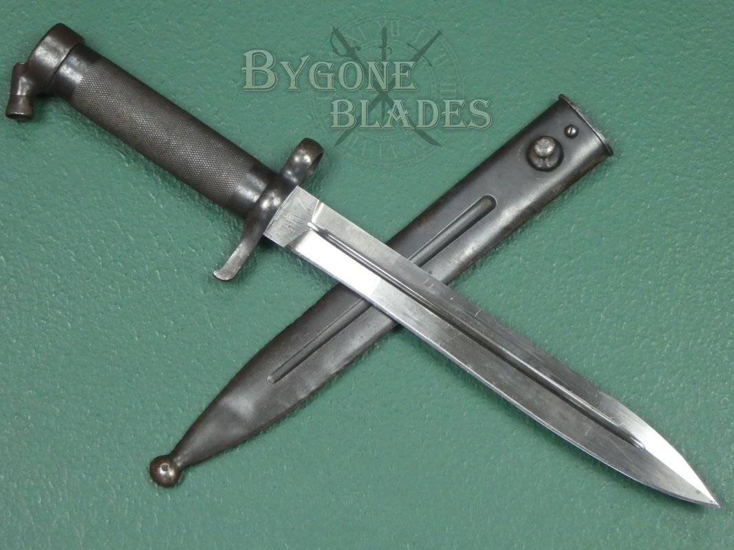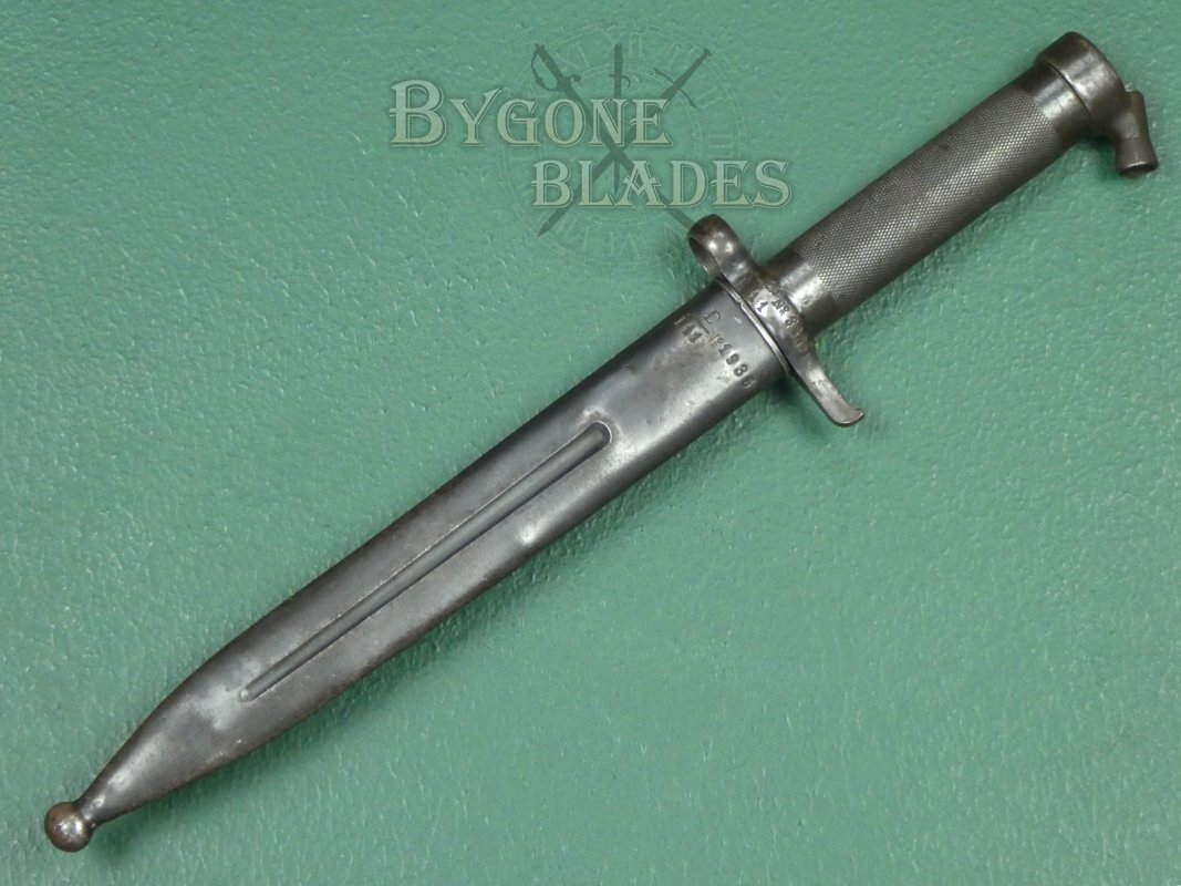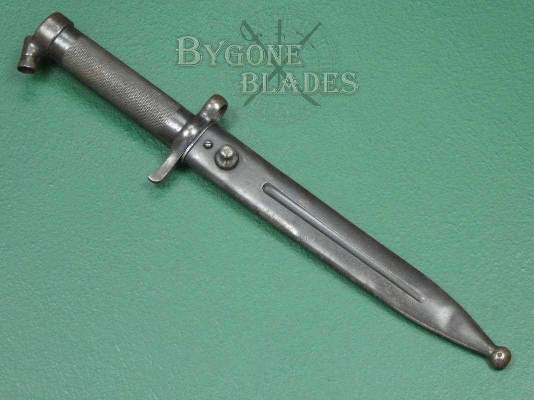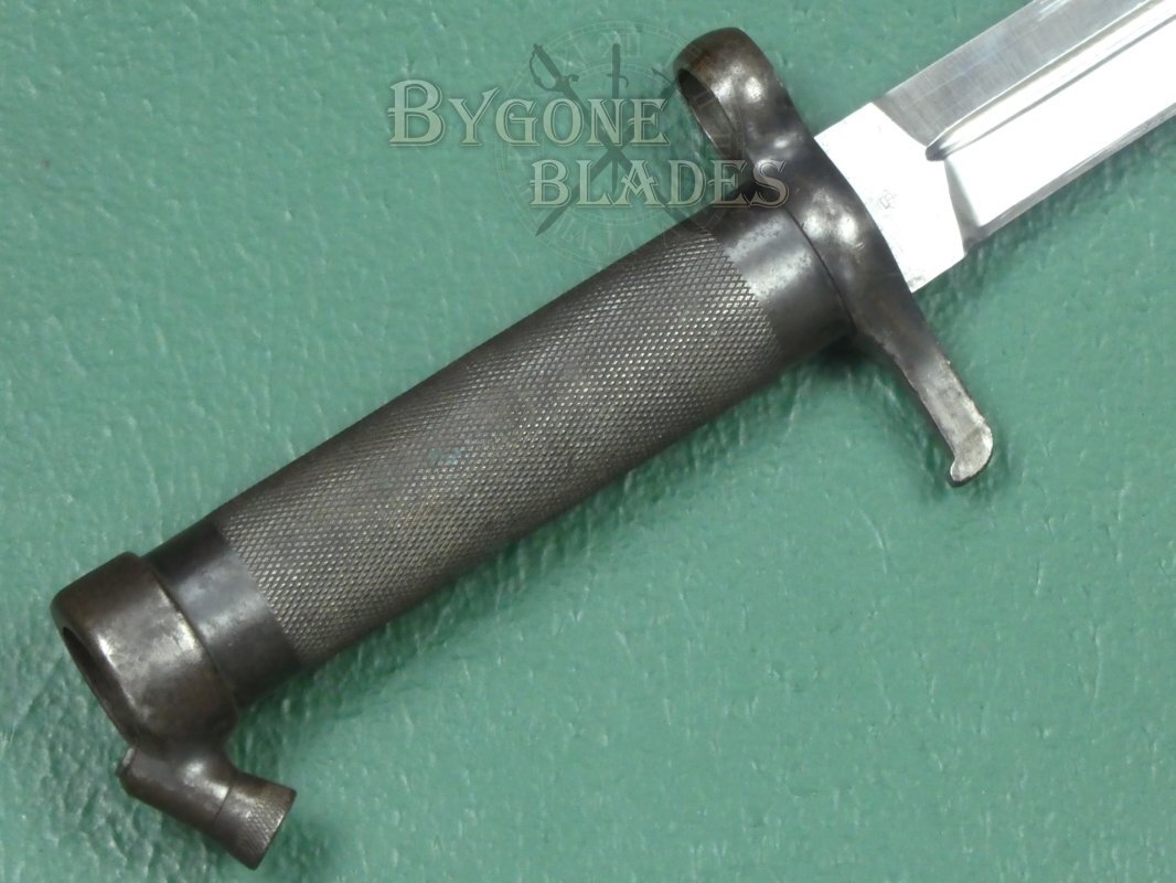 The bayonet is complete with its blued steel scabbard. The scabbard has the expected wear to the blueing and is in excellent condition. The bayonet sheathes and draws smoothly and is held firmly within the scabbard.