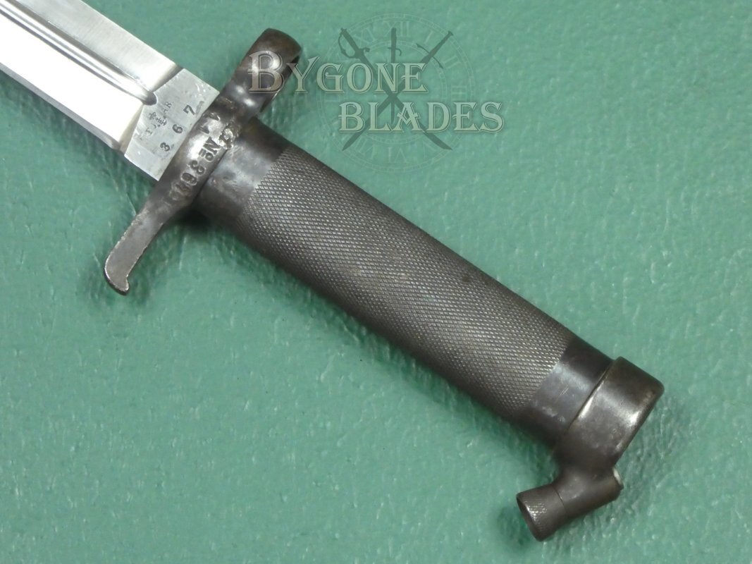 The ricasso bears the makers anchored logo above the serial number “367”. The obverse has a crowned inspection stamp.