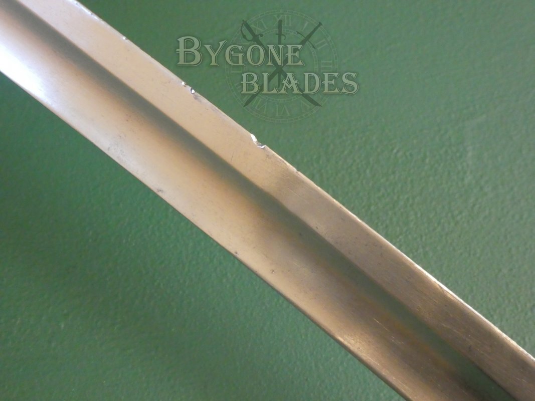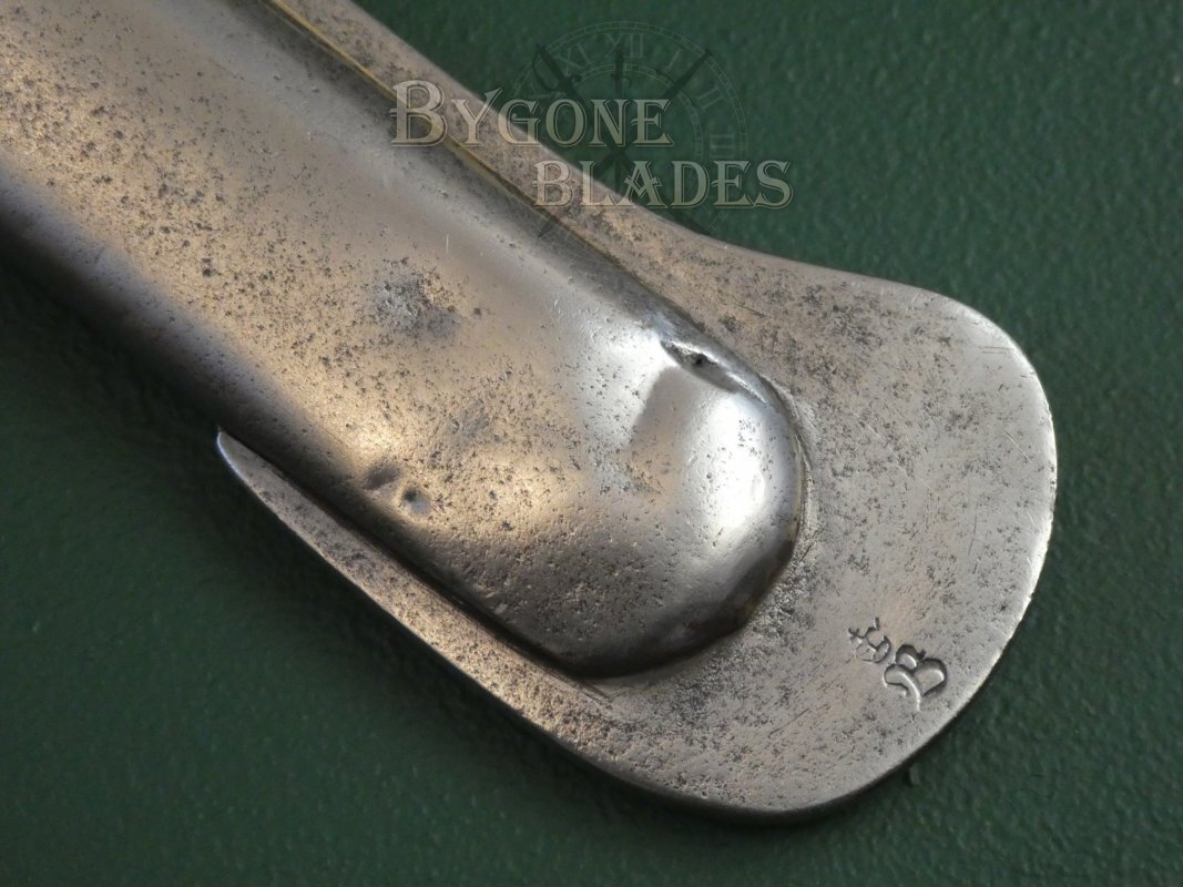 The sabre is complete with its polished steel scabbard which is in great condition, with only a very small ding just above the shoe. The sword sheaths and draws smoothly and is held firmly in the scabbard. The scabbard is marked on the shoe with a crown and italicised B.