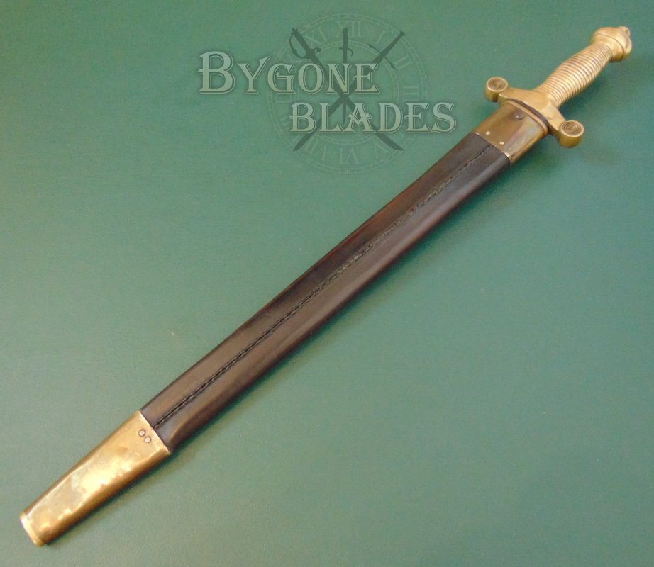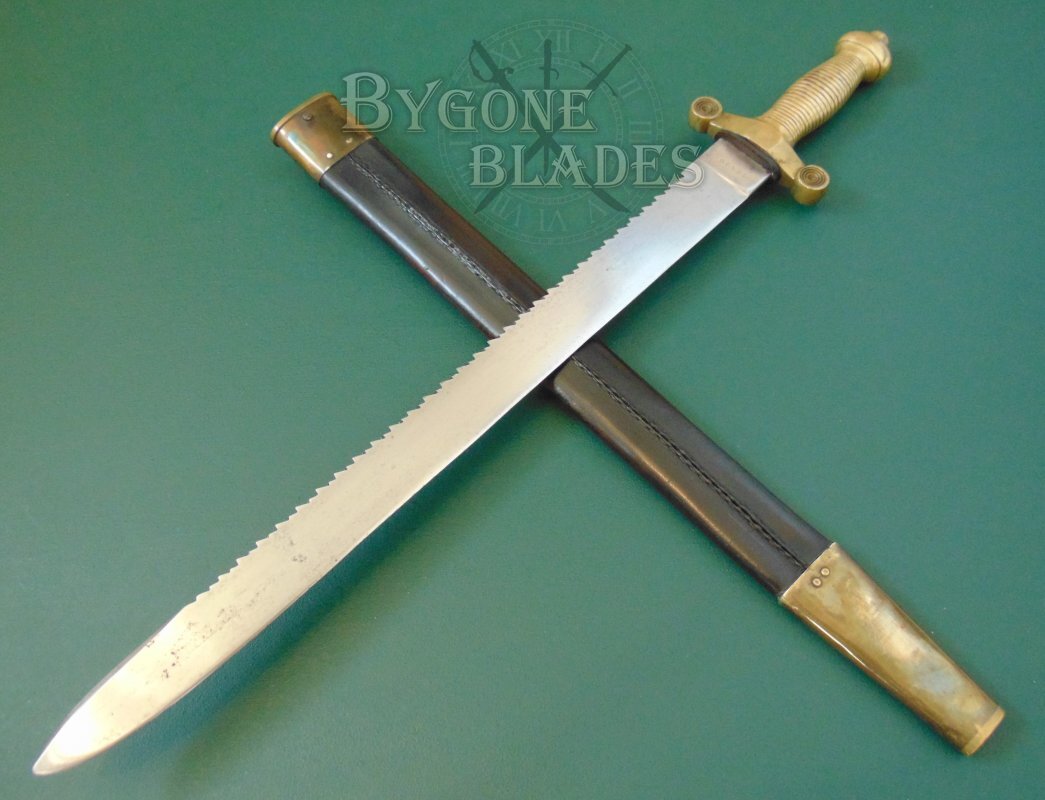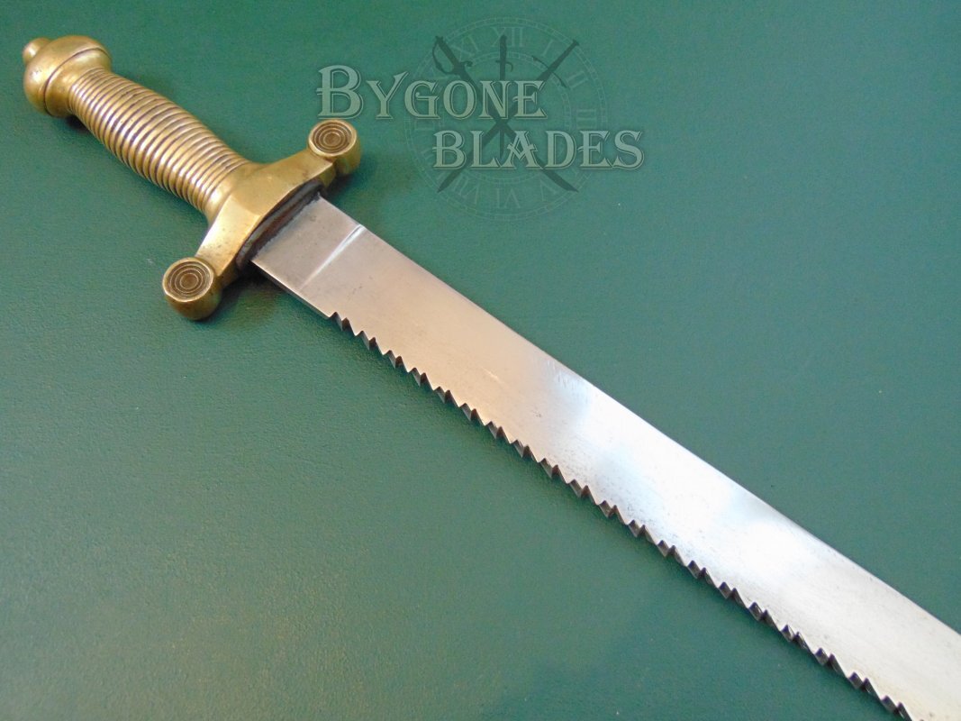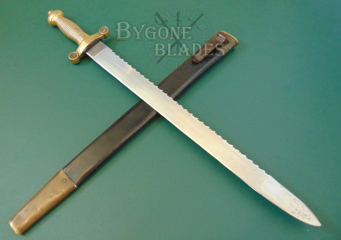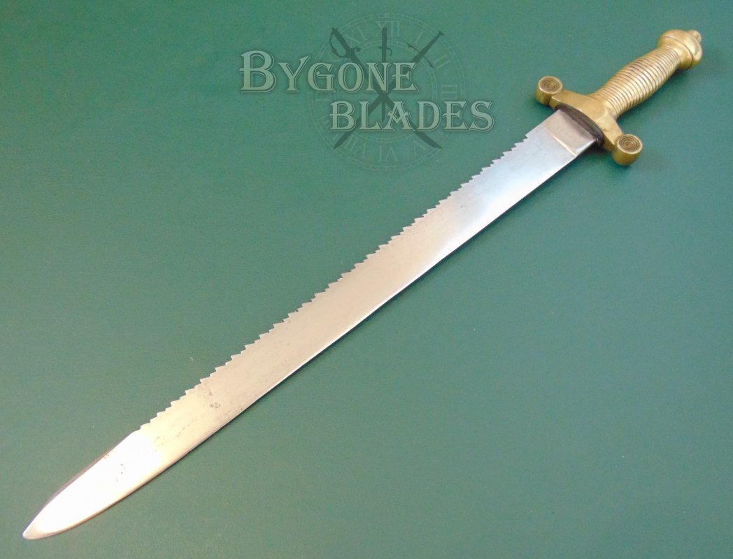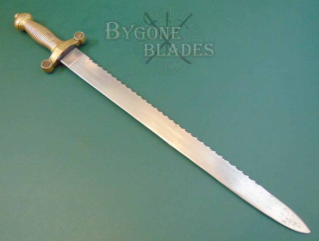 This is an excellent example of the scarce Swiss Model 1842 Pioneer saw back short sword or Faschinenmesser. The sword is of neo-classical gladius form popularised by the French sidearm that was itself inspired by the ancient Roman gladius. These saw backed swords were issued to Pioneer, Engineer and Machinegun units, intended for use as a tool for clearing ground, gun emplacements and fields of fire and also as a close quarter battle weapon.