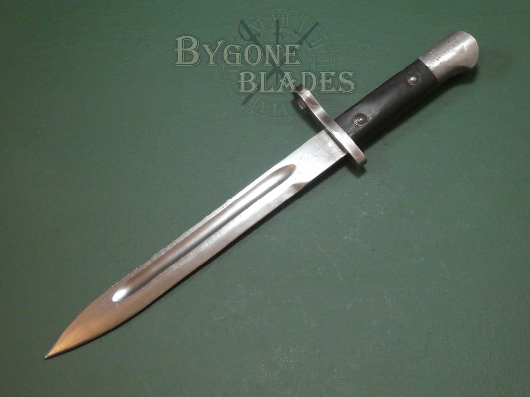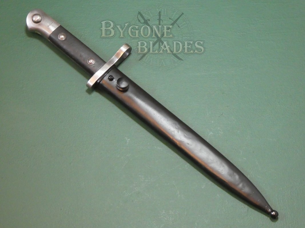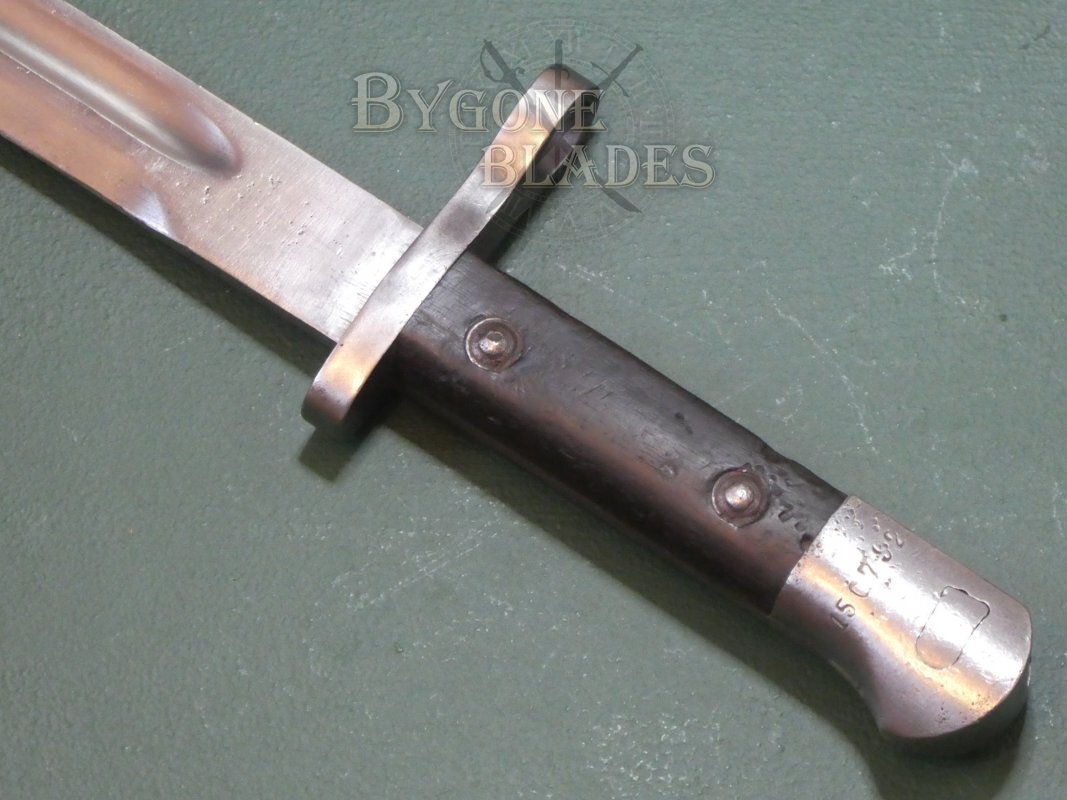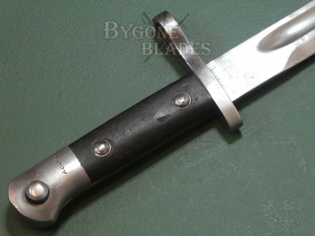 Turkey has a long tradition of modifying imported bayonets to fit their Mauser rifles and in 1935 they began production of their own bayonet, the Model 1935. The M35 bayonet was the last Turkish bayonet designed for use with the Mauser rifle. The designation, Model 1935 however was also applied to a huge variety of similar bayonets of the period that were cobbled together from recycled parts. This example was made from new at the Askari Fabrika arsenal in Turkey.