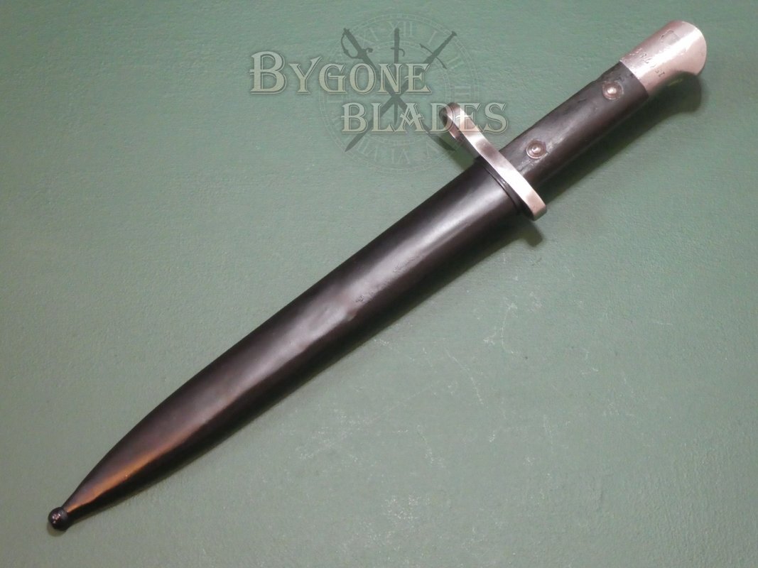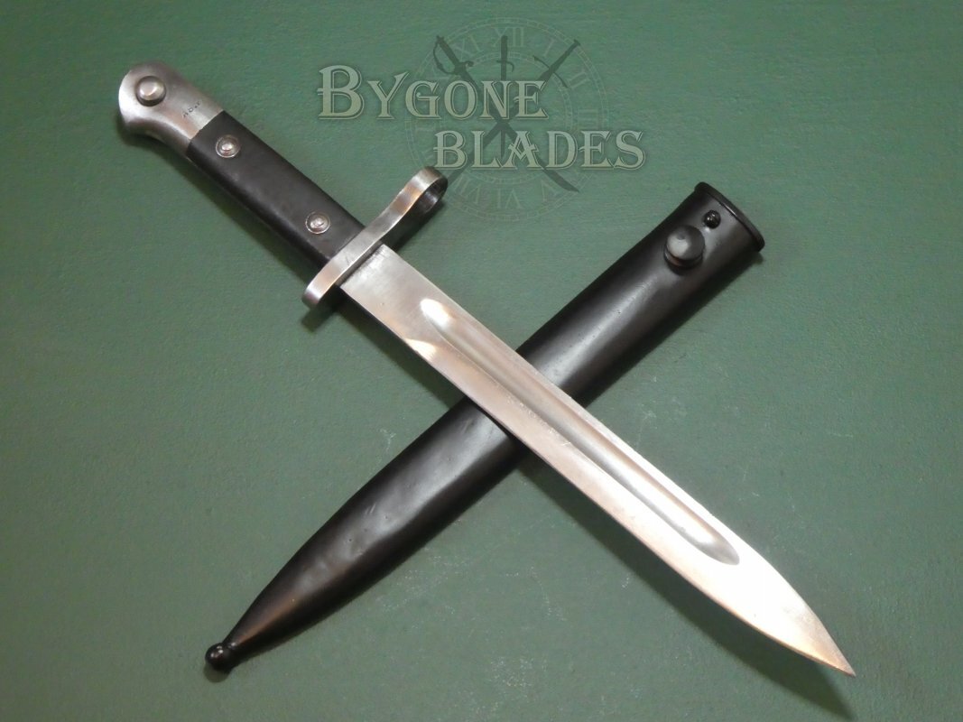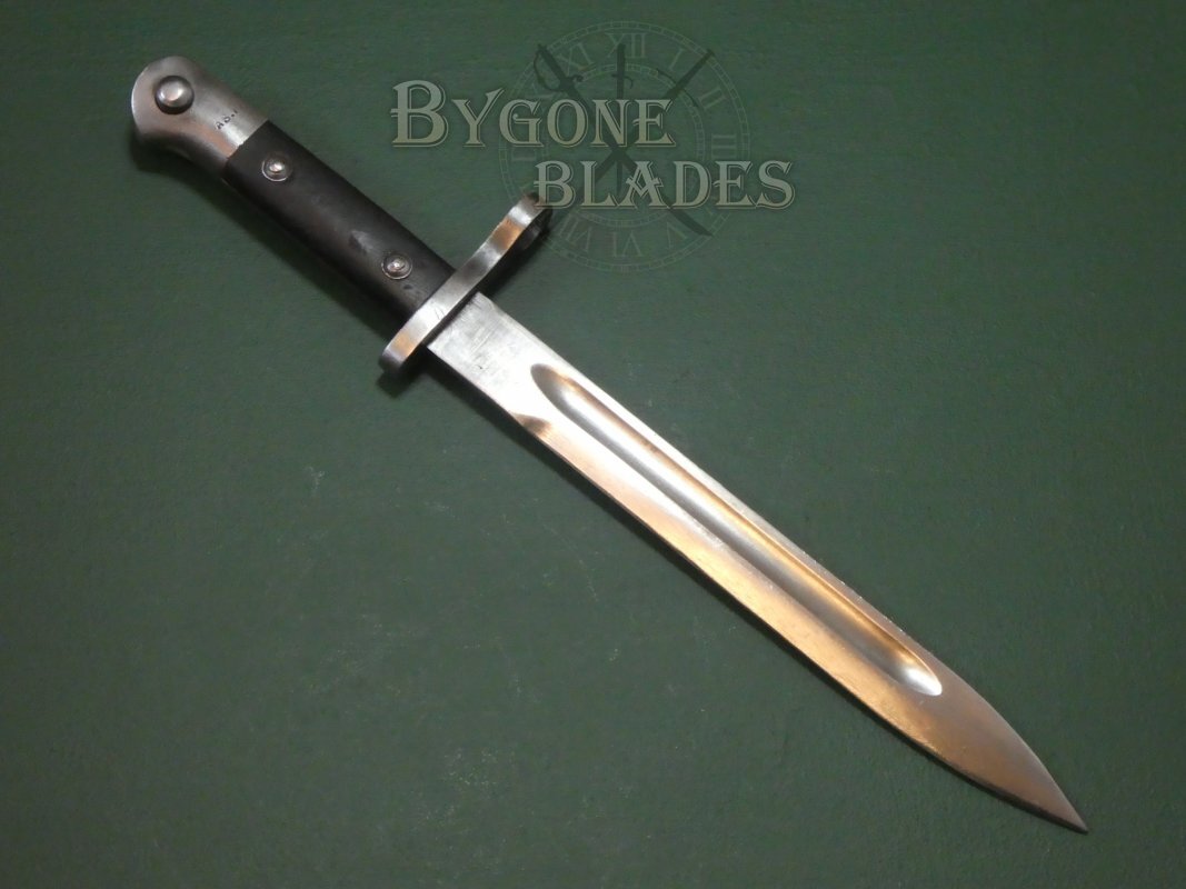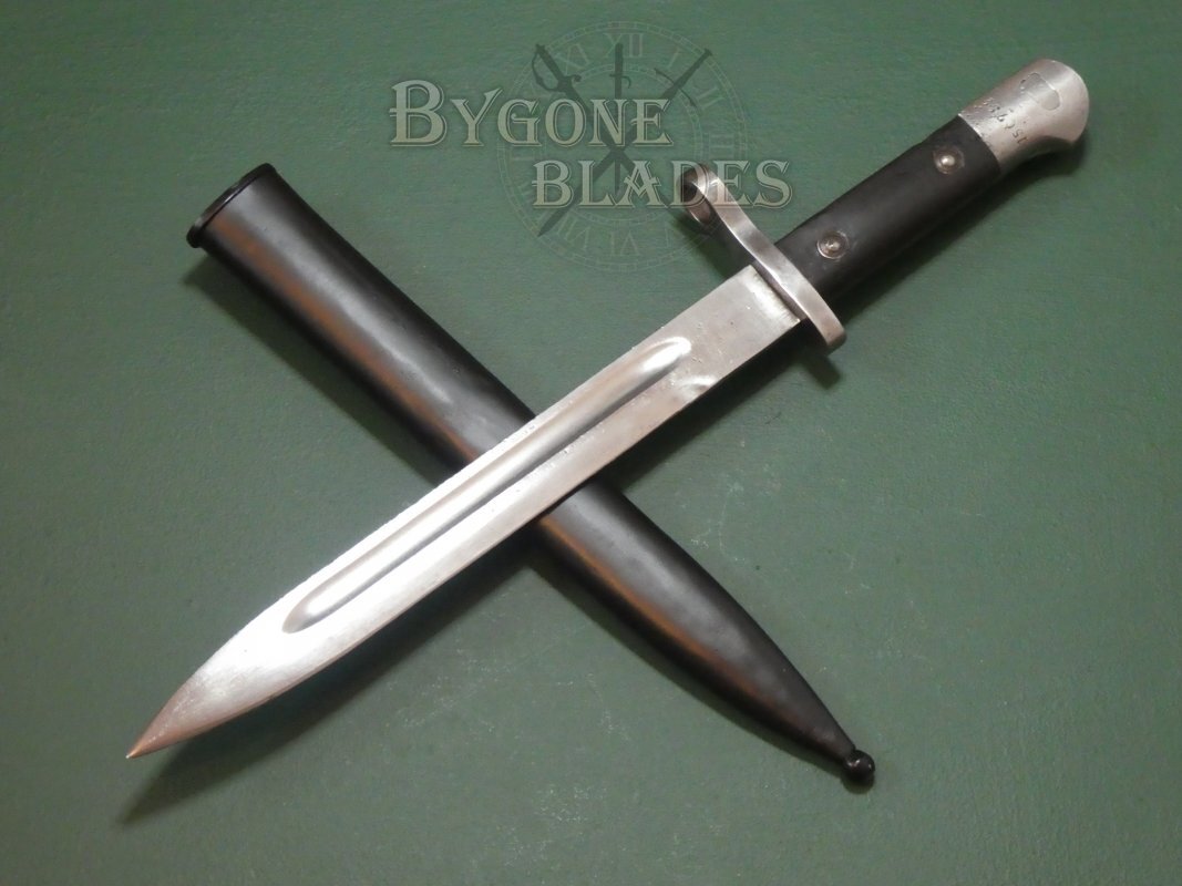 Turkey has a long tradition of modifying imported bayonets to fit their Mauser rifles and in 1935 they began production of their own bayonet, the Model 1935. The M35 bayonet was the last Turkish bayonet designed for use with the Mauser rifle. The designation, Model 1935 however was also applied to a huge variety of similar bayonets of the period that were cobbled together from recycled parts. This example was made from new at the Askari Fabrika arsenal in Turkey.