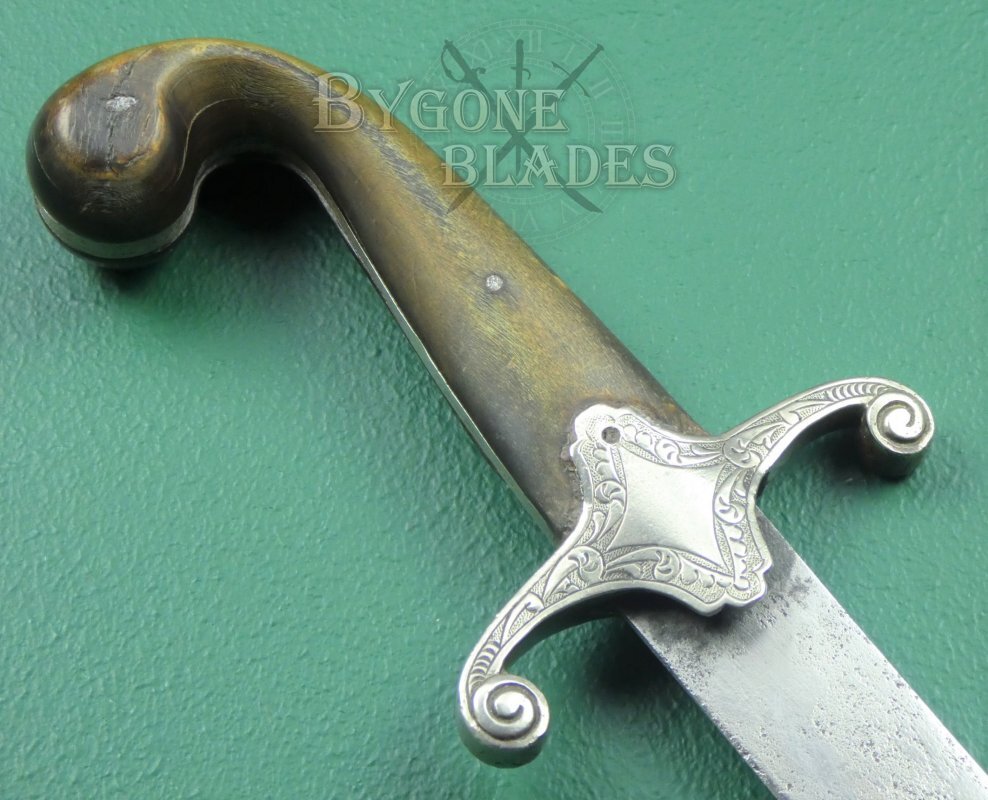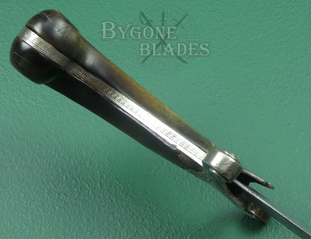 The horn hilt is of typical pistol-grip form and is furnished with silver. The decorative silver crosspiece has down-turned scrolled quillons and shaped languets. The hilt is in good condition and the blade is firm, the horn grip scales being riveted through the tang.