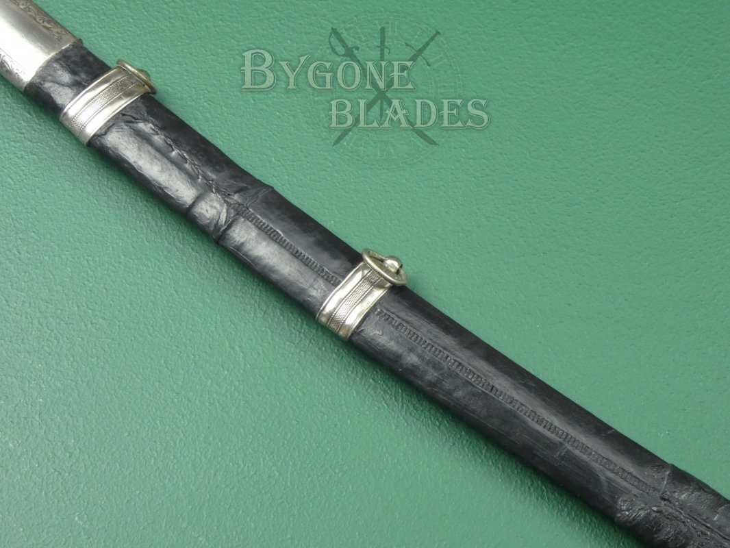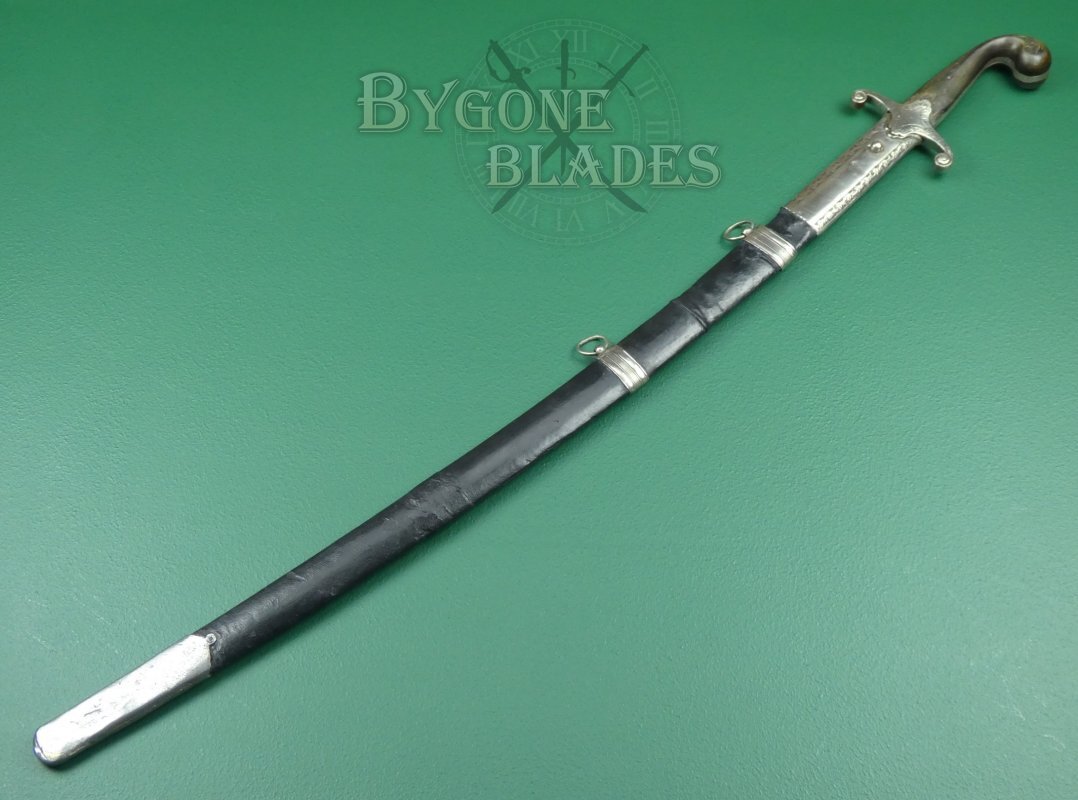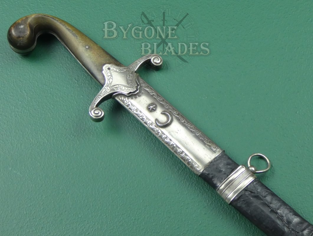 The sword is complete with its leather covered wooden scabbard with silver mounts. The decoration on the mounts matches that of the crosspiece and the shaped languets mate with the shaped top of the locket. The front of the locket bears the star and crescent of the Ottoman Empire and the obverse incorporates a bead-like silver ball through which a chain or cord may have passed. The scabbard has two silver suspension bands with rings. The scabbard is finished with an iron chape. The chape has a figural top and the front is engraved with a floral motif.
