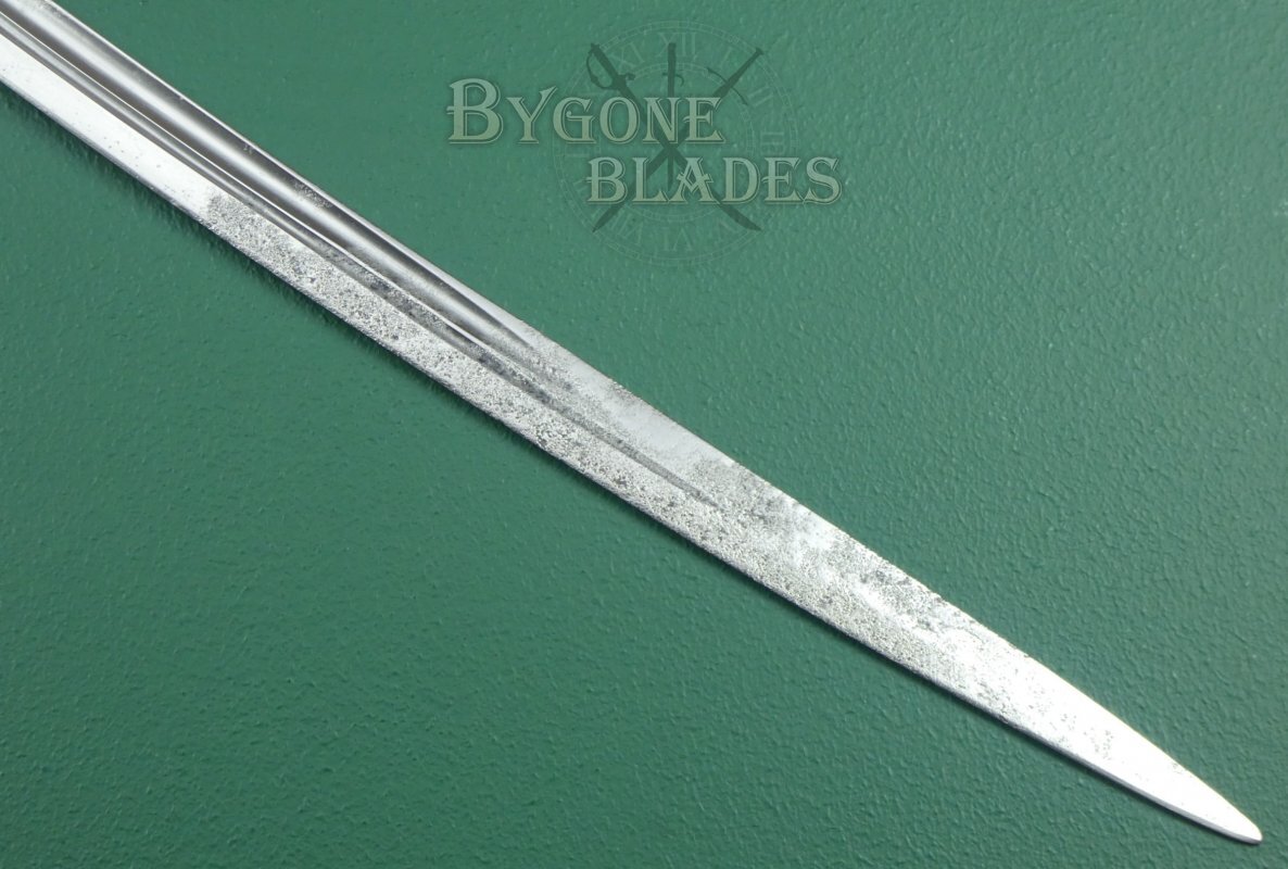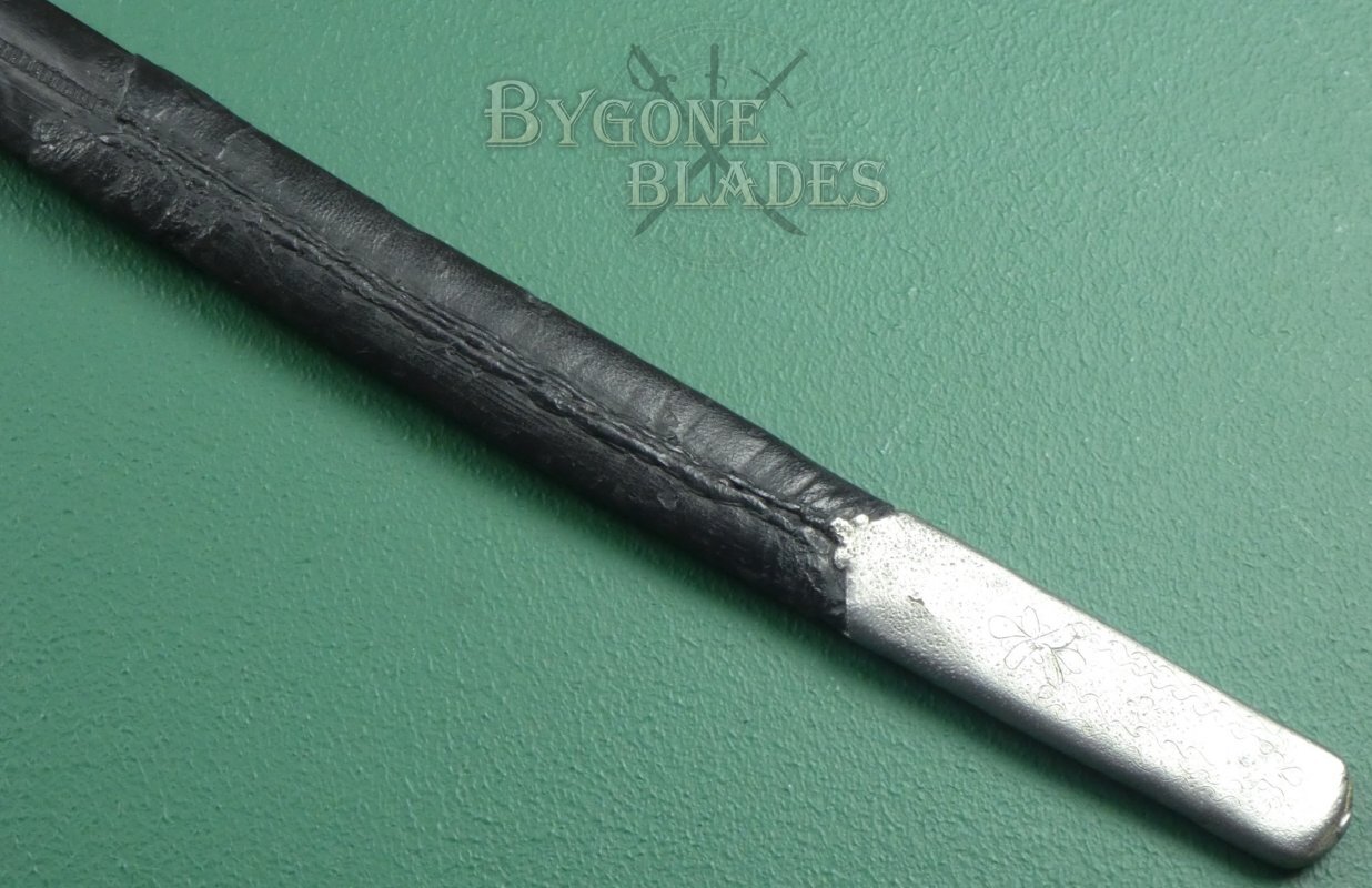 The leather of the scabbard has a period repair, additional leather having been sewn over the original. The repair is strong and the stitching intact. The scabbard is in overall good condition and the sword sheathes fully and is held firmly within.