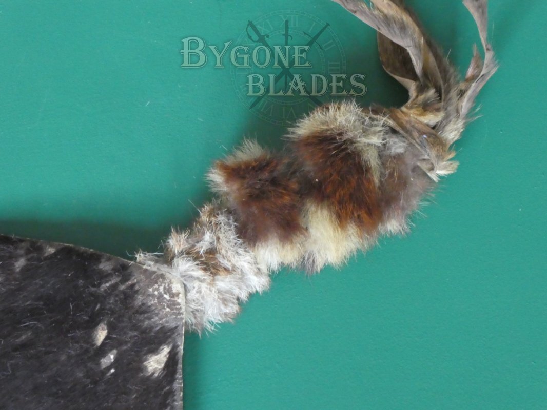 The staff is decorated with soft fur that is brown and buff in patches (although it has faded due to its age).