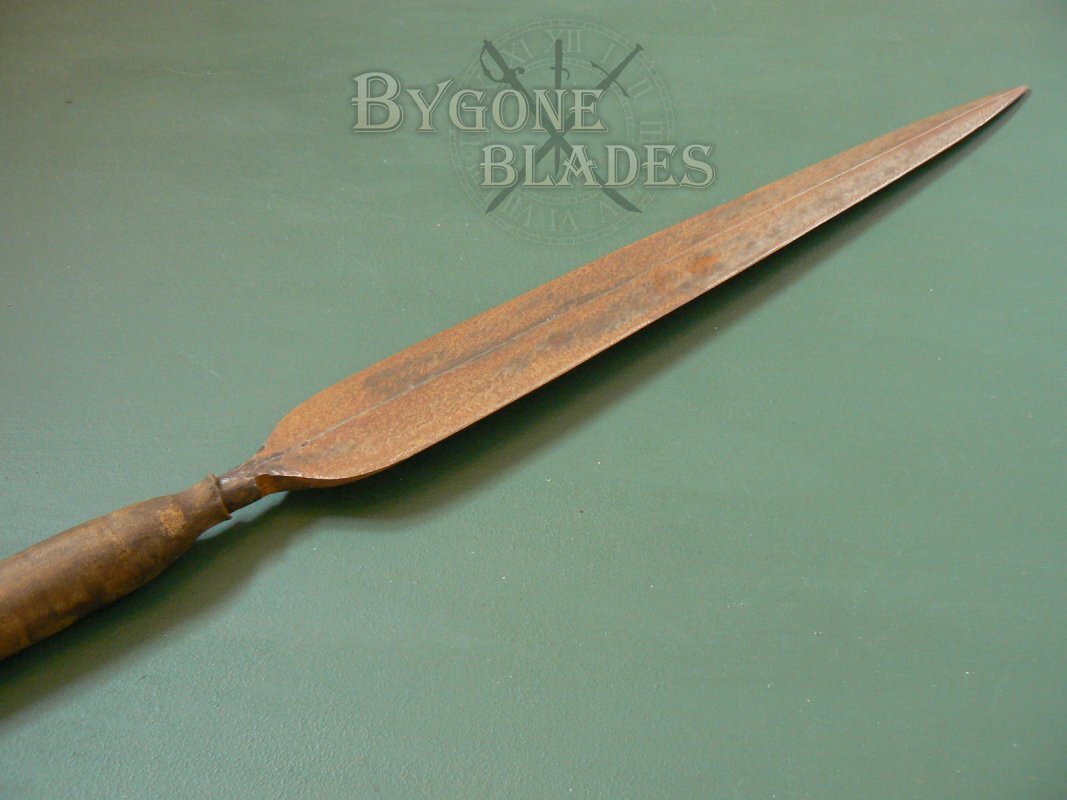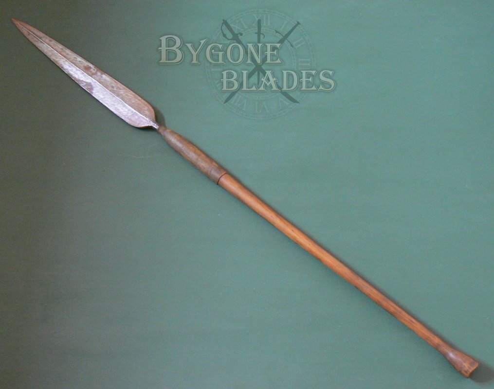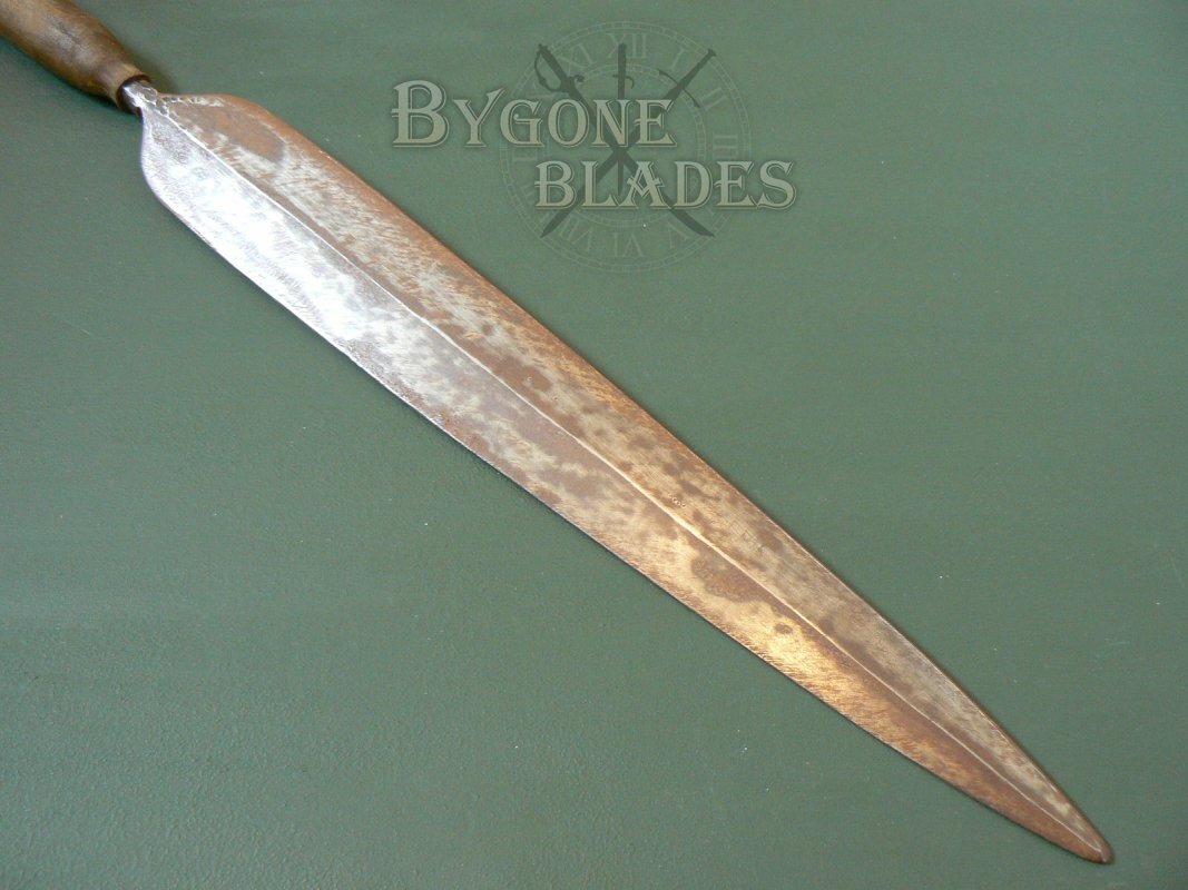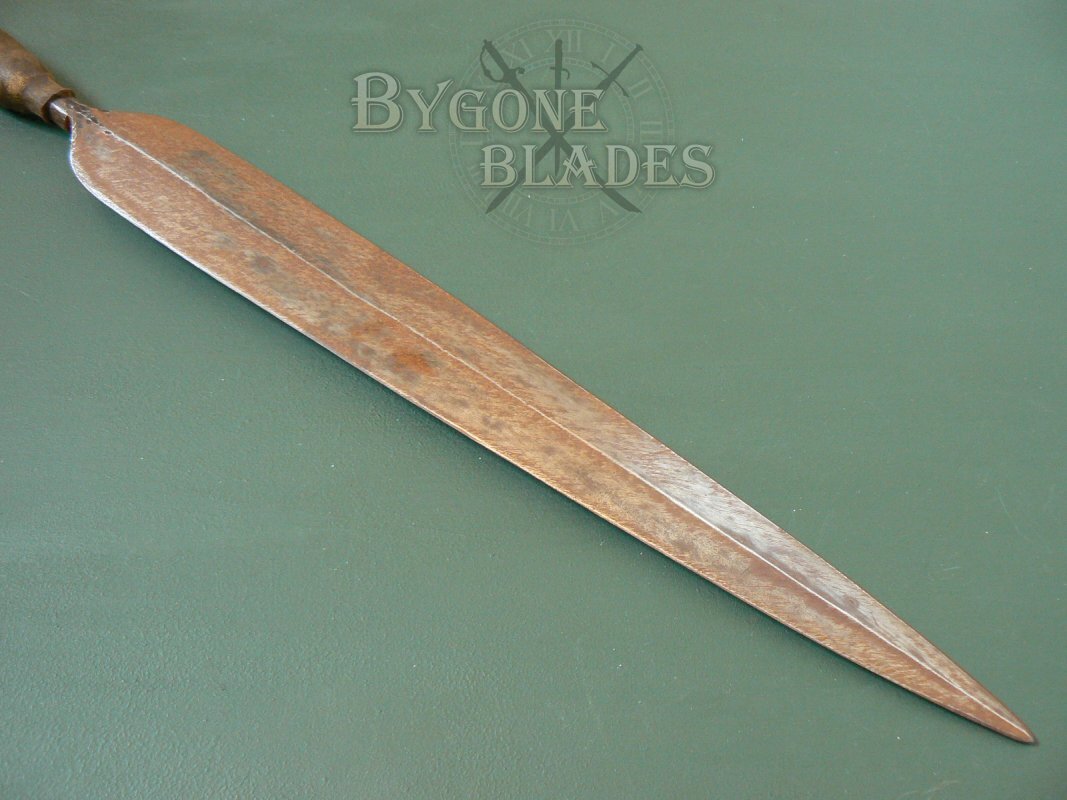 This Zulu Iklwa (pronounced correctly, the name mimics the sound of the blade being withdrawn from flesh), has a 410 mm hand forged blade. The blade is approximately 51 mm at its widest and is in good condition with minor age related tarnish that adds to its character.