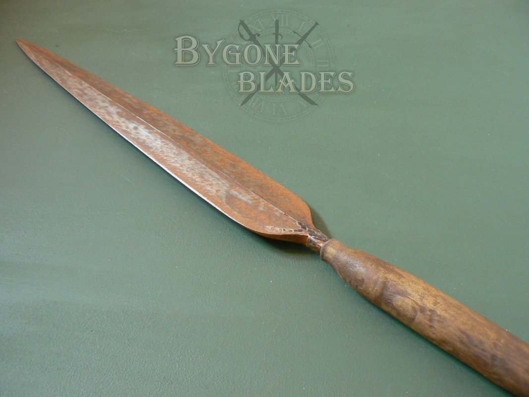 Traditionally there were three types of binding used to secure the blade into the haft – wire, cow tail and Ilala palm. The blade is firm within the haft and the 650 mm haft has a wonderful patina and flares nicely at the end.