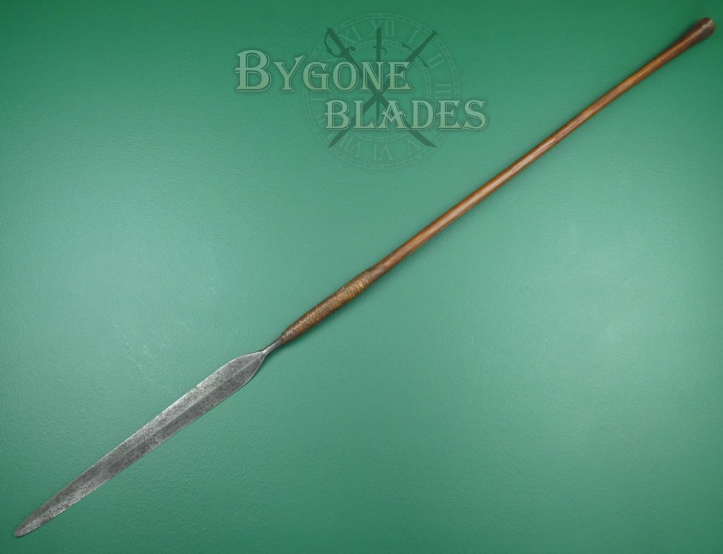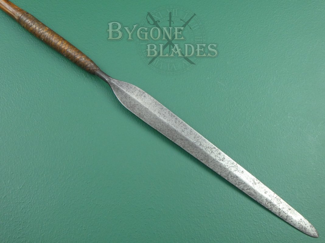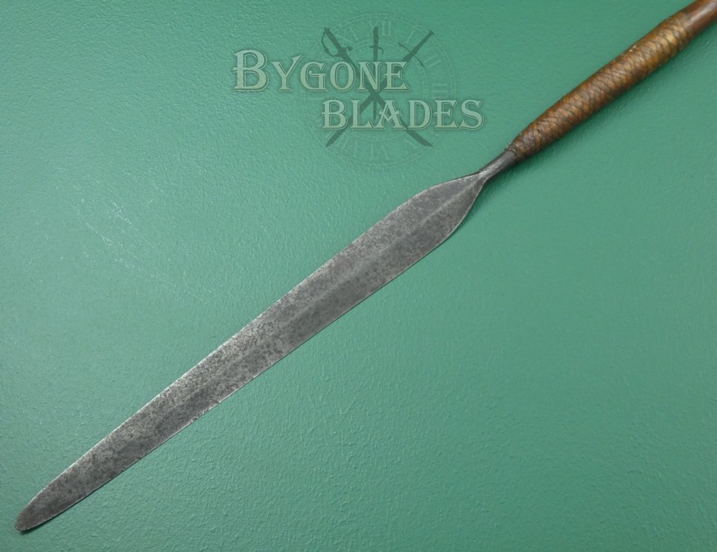 The long 450mm hand forged blade has a flattened diamond section with a raised medial ridge. The blade is 43mm at its widest and is in good condition with a pleasing patina and clear forging marks that add to its character.