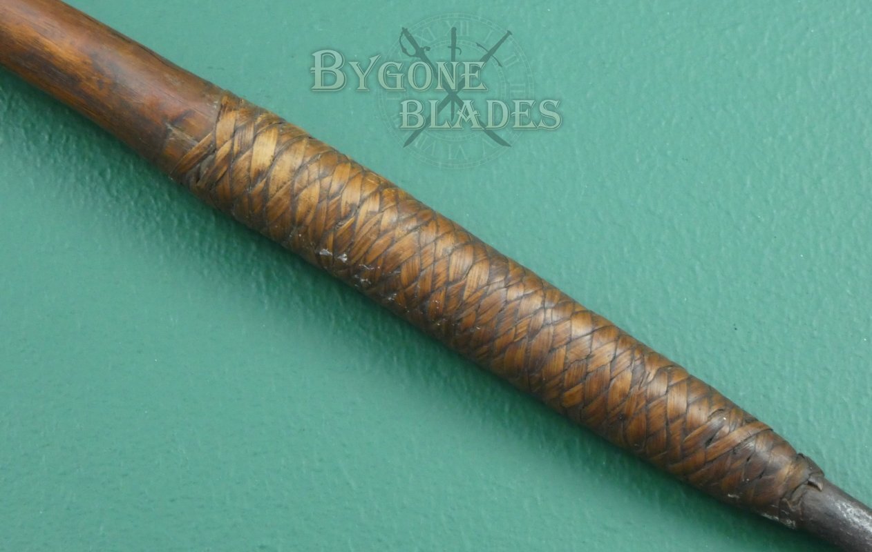 The blade is secured firmly within the haft and woven ilala palm binding was added to strengthen the bond. The woven binding is in excellent condition.