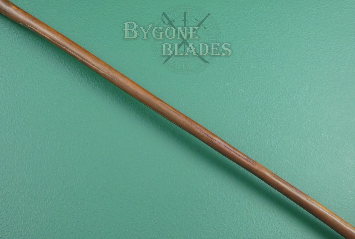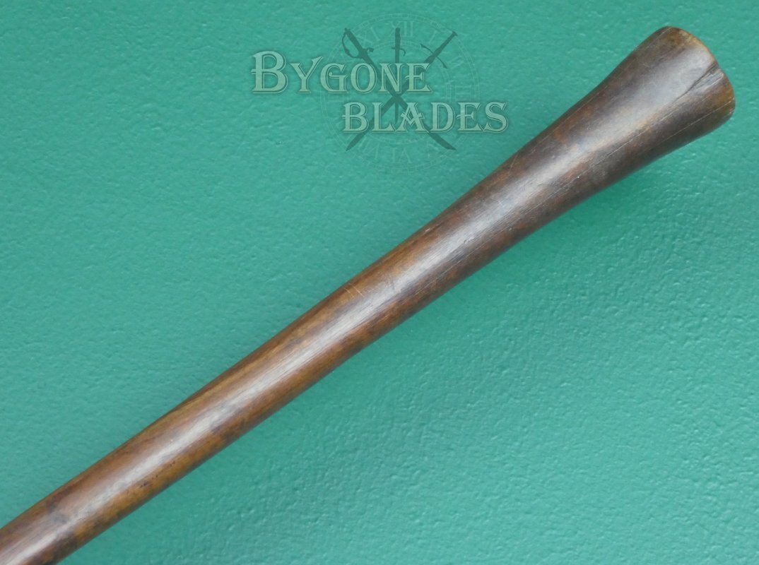 The 890mm haft has a wonderful patina and flares nicely at the end. The Cape Lancewood haft has some age related splits that have been filled. The splits are stable and the haft is strong.