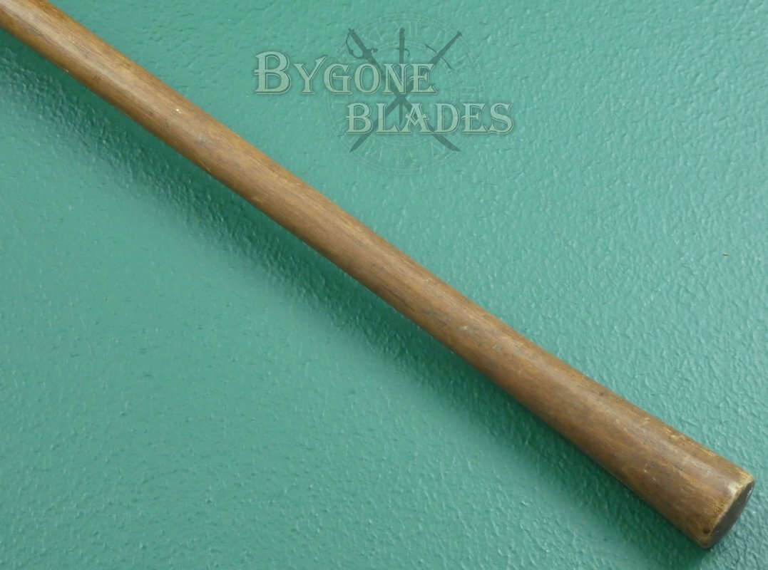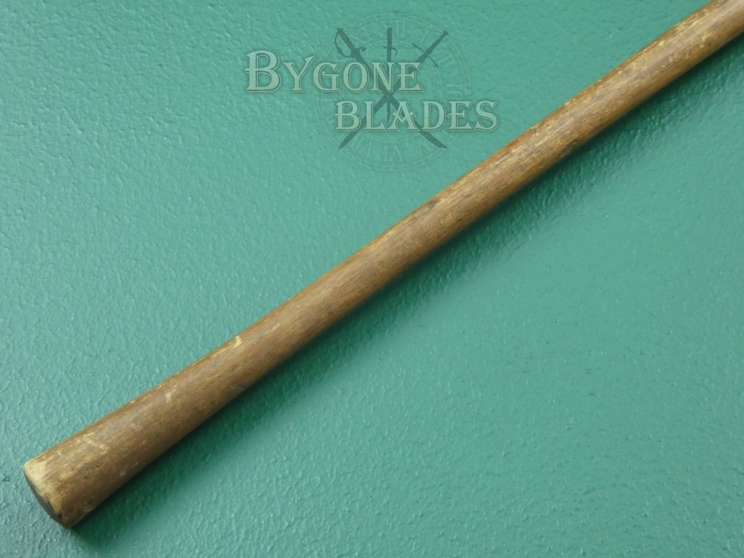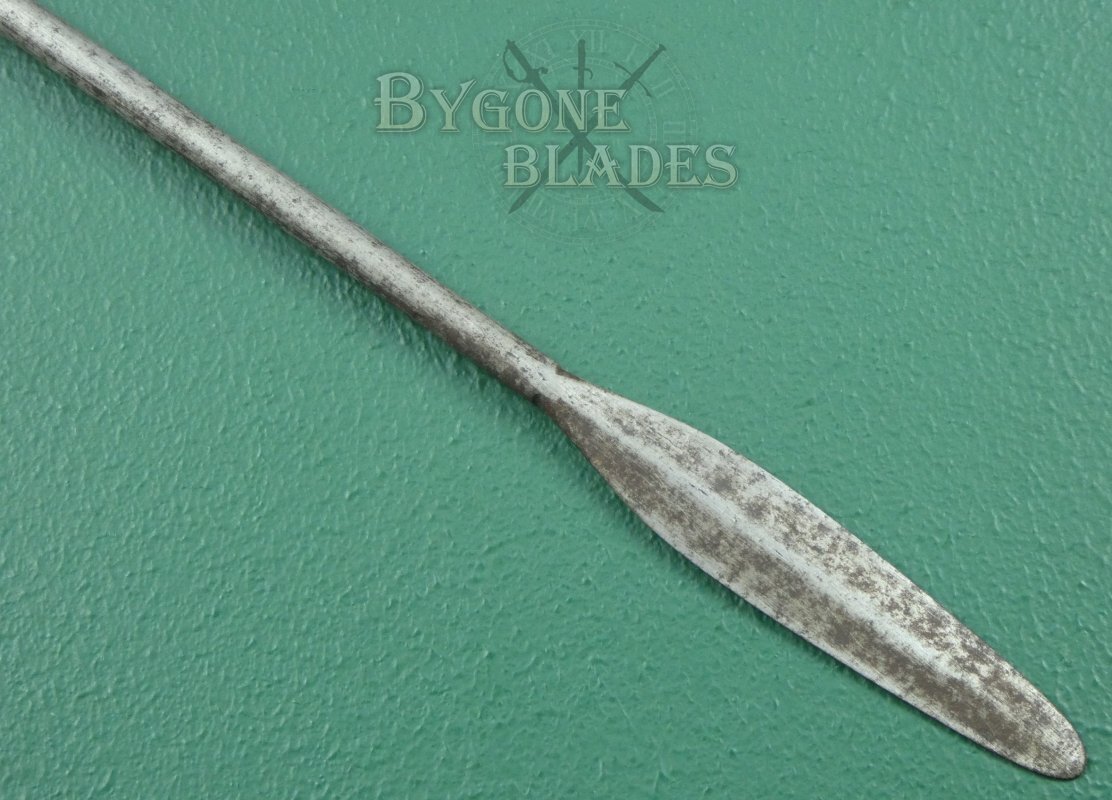 The hand forged blade has a flattened diamond section with raised medial ridge. The blade is in great condition with a wonderful patina and clear forging marks that add to its character.